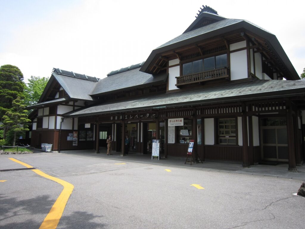 華厳滝の観瀑台に向かうための有料エレベーター。 受給者証の提示で本人と付き添いが小学生料金になります。